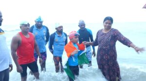 இலங்கை தலைமன்னாரில் இருந்து இன்று சனிக்கிழமை அதிகாலை 2.45க்கு கடலில் குதித்து நீந்த தொடங்கி மதியம் 12 மணி அளவில் தனுஷ்கோடி வந்தடைந்தனர். இவர் தலைமன்னார் முதல் தனுஷ்கோடி வரை 9 மணி நேரம் 11 நிமிடத்தில் நீந்தி கடந்தார்.