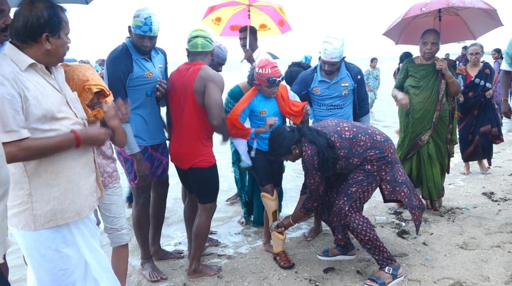 இயலாமைக்கும் சாதனைக்கும் உள்ள தூரத்தை நீந்தி கடந்து சாதனை படைக்க வேண்டும் என்ற லட்சியத்துடன் முழங்காலுக்கு கீழே பாதிக்கப்பட்ட 12 வயது மாற்றுத்திறனாளி சிறுவன் கடந்த வெள்ளிக்கிழமை (3) இலங்கை தலைமன்னாரிலிருந்து தனுஷ்கோடி வரையிலான பாக் ஜலசந்தி கடலை 9 மணி 11 நிமிடத்தில் நீந்தி கடந்து சாதனை படைத்துள்ளார்.
