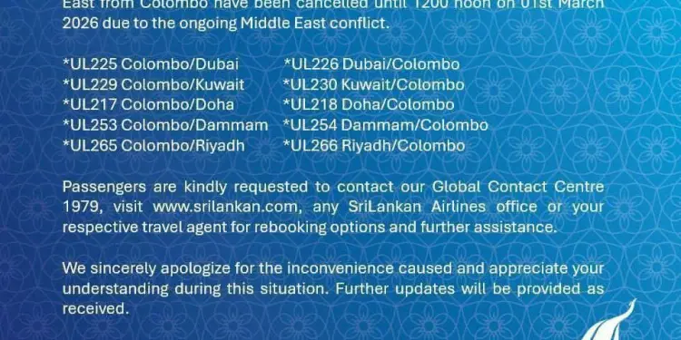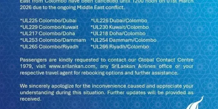 மத்திய கிழக்கில் நிலவும் போர்ச் சூழல் காரணமாக, கொழும்பில் இருந்து மத்திய கிழக்கு நாடுகளுக்குப் புறப்படும் அனைத்து விமான சேவைகளும் நாளை (01 ) மதியம் 12.00 மணி வரை இரத்து செய்யப்பட்டுள்ளதாக ஸ்ரீலங்கன் எயார்லைன்ஸ் அறிவித்துள்ளது.