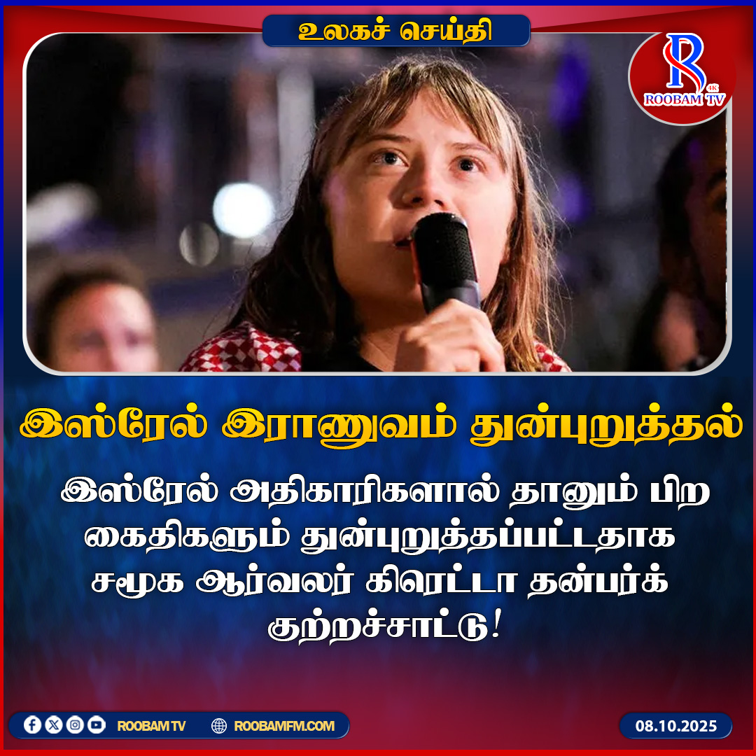 இதன்பின்னர் இன்று (8) செய்தியாளர்களுடன் பேசிய கிரெட்டா , சிறையில் இஸ்ரேல் இராணுவத்தினர் தன்னையும் மற்ற கைதிகளையும் துன்புறுத்தியதை ஒப்புக்கொண்டுள்ளார்.