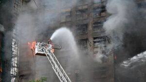 இதனிடையே, இந்த அடுக்குமாடி குடியிருப்பில் நேற்று மாலை 3 மணியளவில் பயங்கர தீ விபத்து ஏற்பட்டது. தீ மளமளவென அடுக்குமாடி குடிருப்பின் பல்வேறு தளங்களுக்கு வேகமாக பரவியது. மேலும், கட்டுமான பணிகளுக்காக அமைக்கப்பட்டிருந்த மர கட்டமைப்புகள் மூலமாக தீ மளமளவென அருகில் இருந்த அடுக்குமாடி குடியிருப்புகளுக்கும் பரவியது.