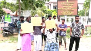யாழ்ப்பாணம் வடமராட்சி கிழக்கு நாகர்கோவில் மேற்கு கடற்தொழிலாளர் சங்கத்திற்கு உட்பட்ட சங்க உறுப்பினர்கள் இன்று வடமராட்சி கிழக்கு பிரதேச செயலகம் முன்பாக கவனயீர்ப்பு ஆர்ப்பாட்டத்தில் ஈடுபட்டனர்