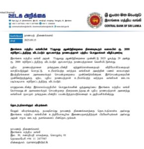 இலங்கை மத்திய வங்கி அதன் 75ஆவது ஆண்டு நிறைவை முன்னிட்டு 2025 ஒகஸ்ட் 29 ஆம் திகதி 2000 ரூபாய் புழக்கத்திற்கு விடப்படும் வகையில்ஞாபகார்த்த நாணயத்தாளை வெளியிட்டது.