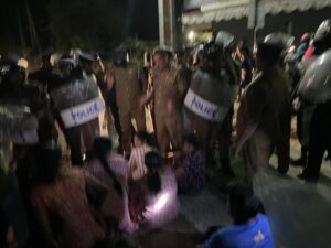 மக்களின் எதிர்ப்பை மீறி நூற்றுக்கணக்கான போலீசார் பாதுகாப்புடன் கழகம் அடக்கும் போலீசார் துணையுடன் காற்றாலை மின் கோபுரங்கள் அமைப்பதற்கான பொருட்கள் பாரிய வாகனங்களில்