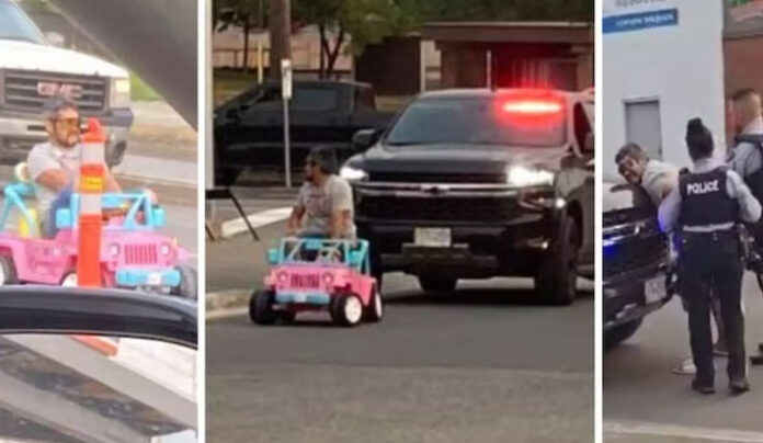கனடாவில் மதுபோதையில் குழந்தைகள் ஓடும் குட்டி பார்பி ஜீப்பை பிரதான சாலையில் ஓட்டி சக வாகன ஓட்டிகளுக்கு இடையூறு ஏற்படுத்திய நபர் ஒருவர் பரபரப்பை ஏற்படுத்தினார்.